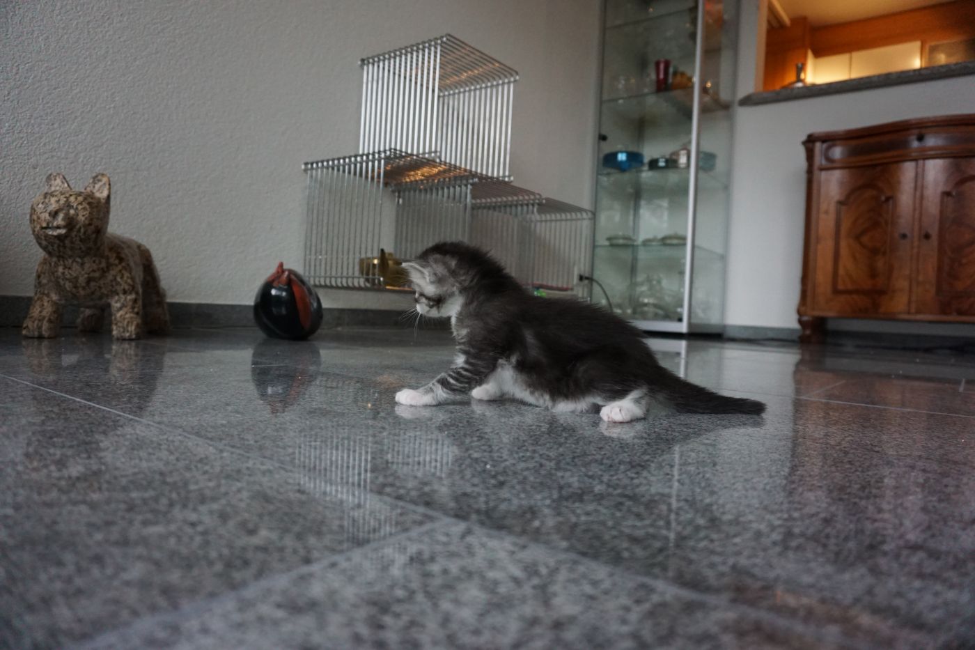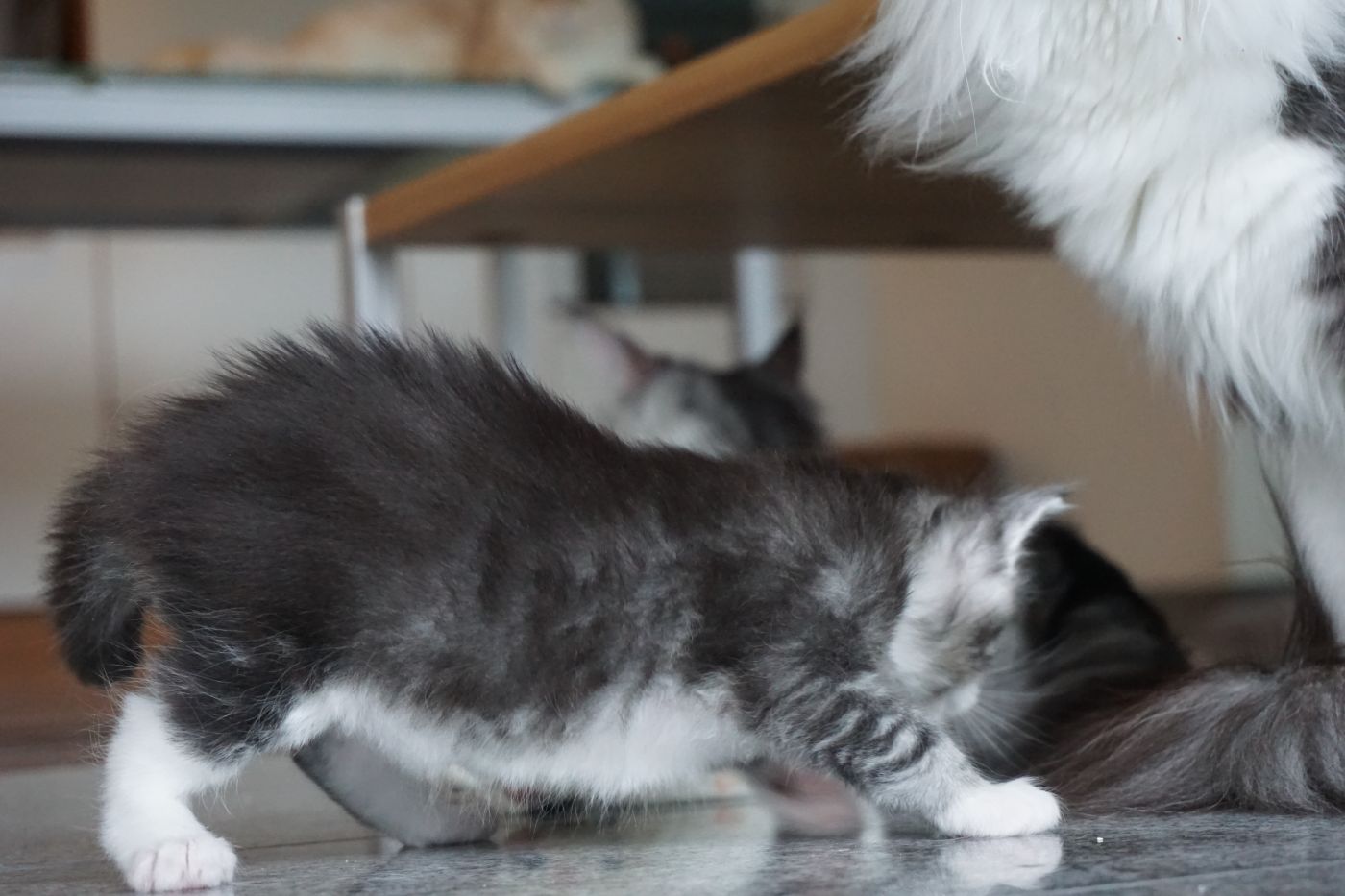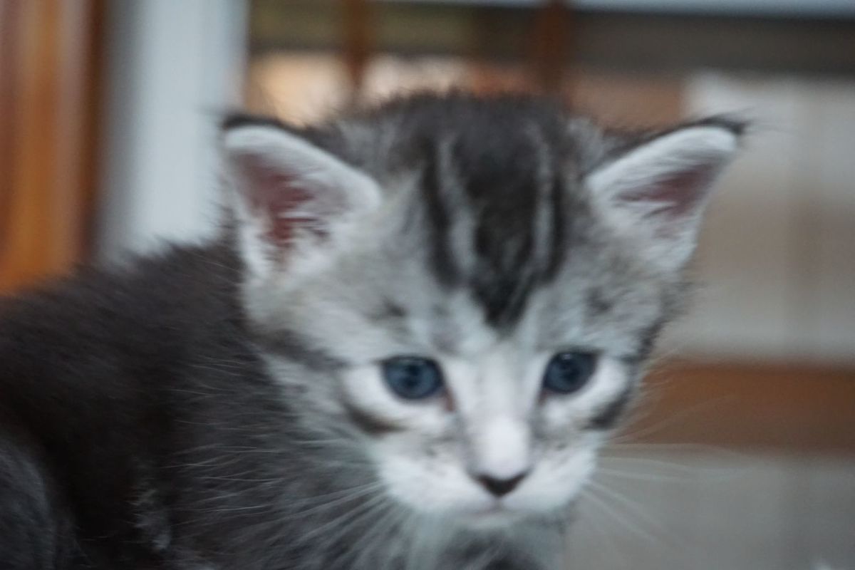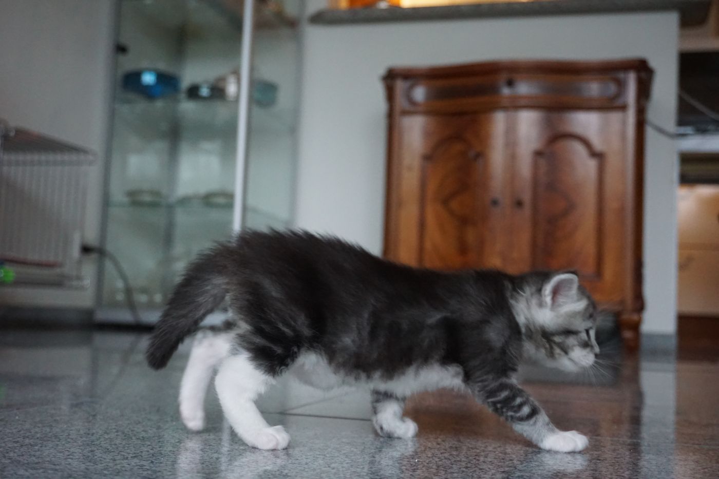 Lenni kam als Nummer Zwei auf die Welt. Er hat ein dunkles black silver ticked tabby mit einer sehr hübschen Weisszeichnung.