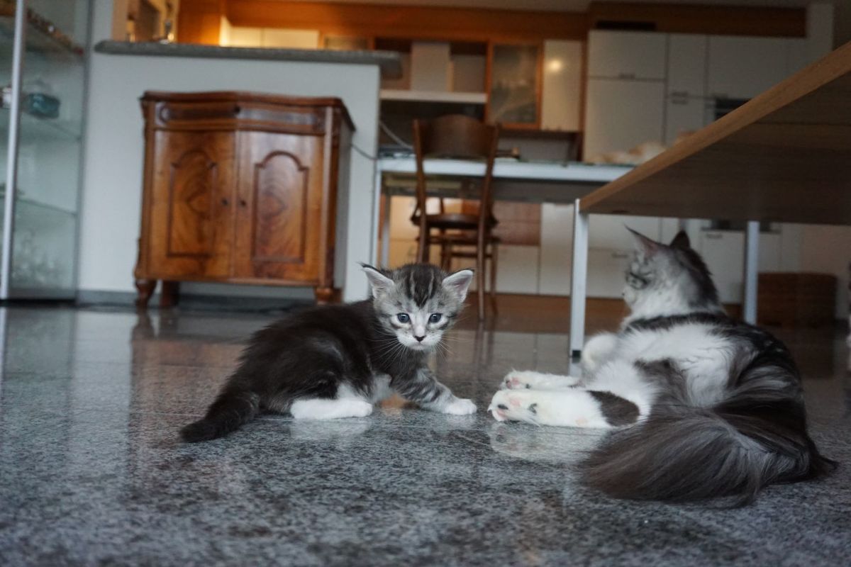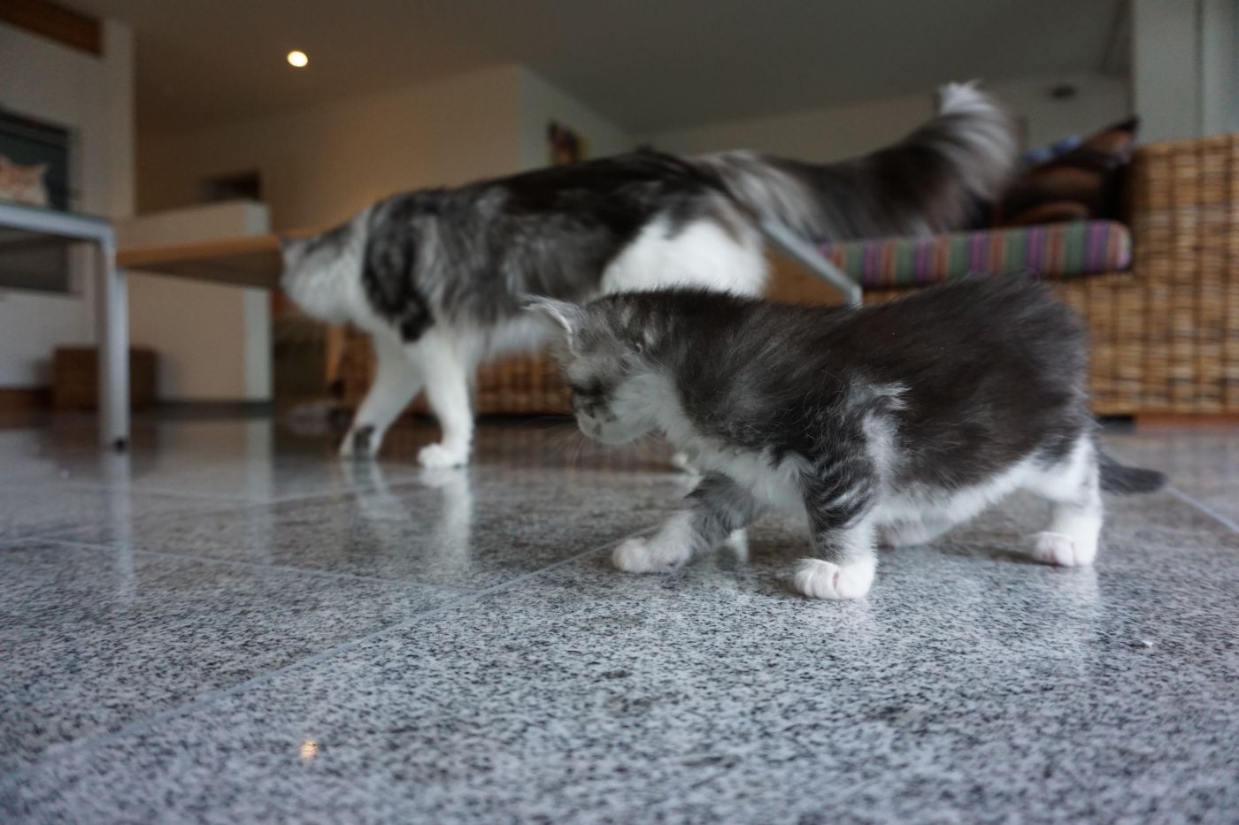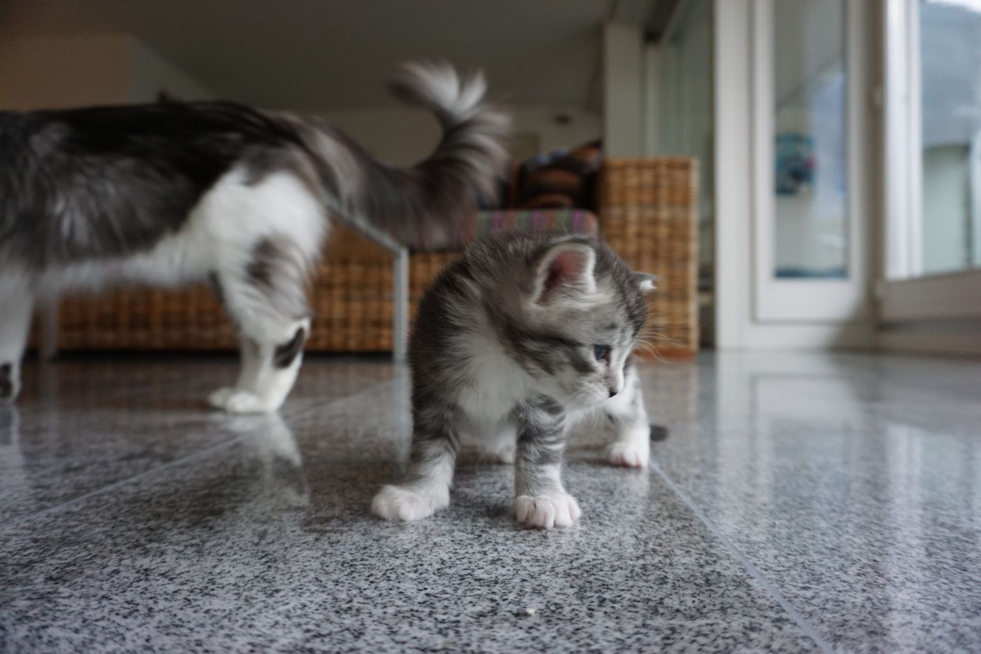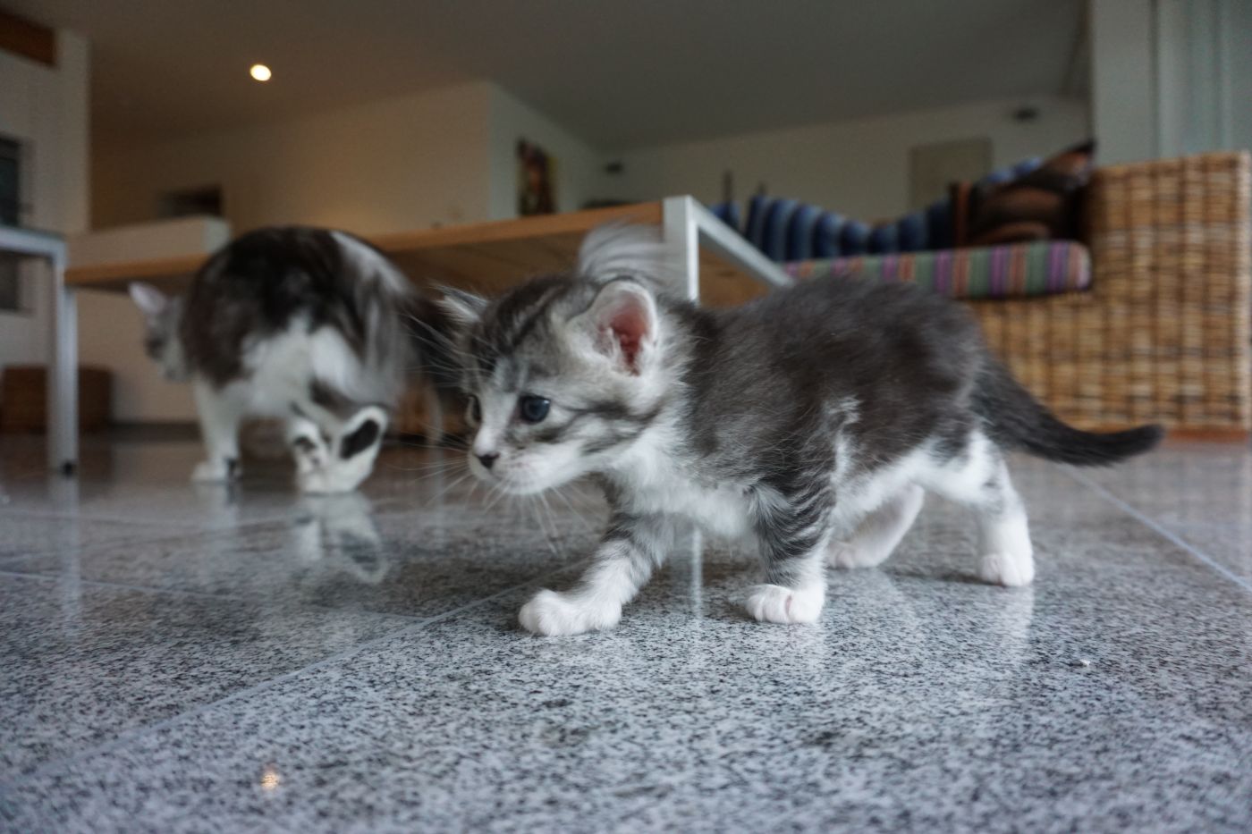 Lenni kam als Nummer Zwei auf die Welt. Er hat ein dunkles black silver ticked tabby mit einer sehr hübschen Weisszeichnung.