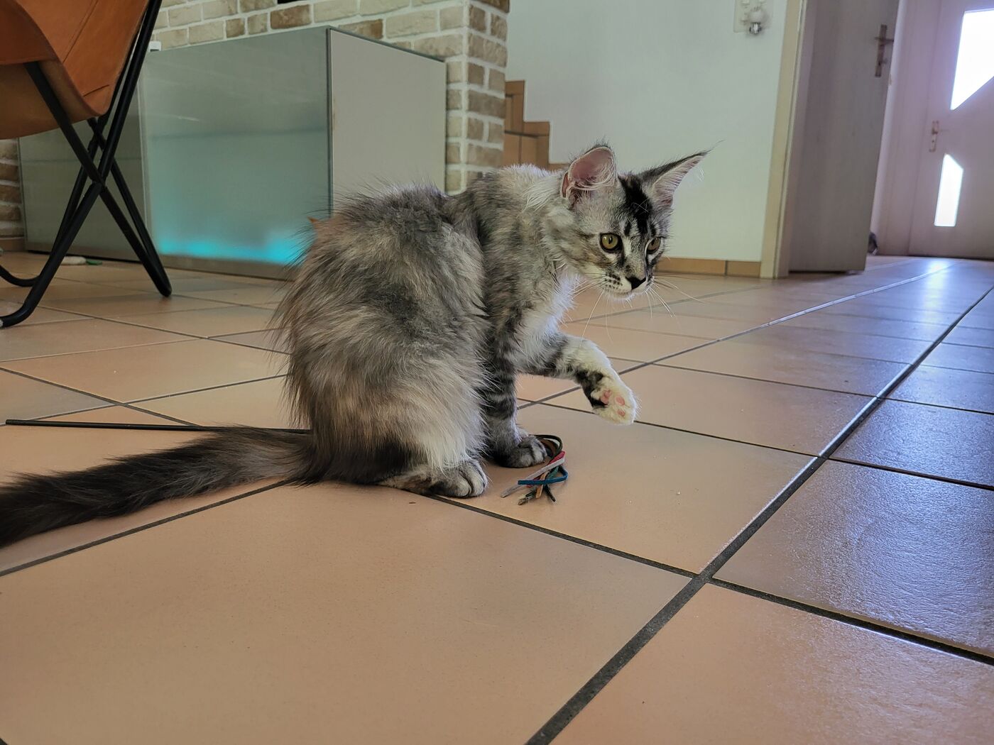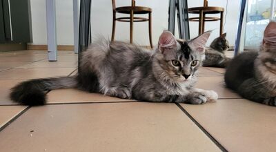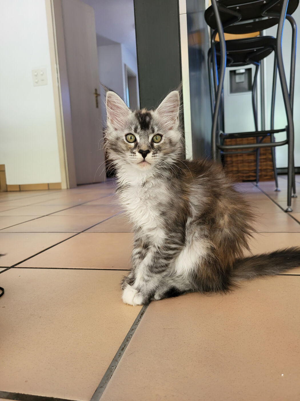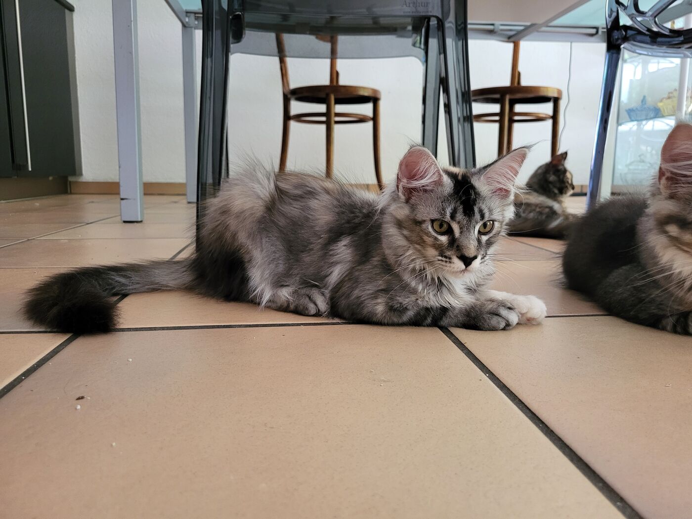 Pebbles ist die Erstgeborene. Ihren Namen, er bedeutet Kieselsteinchen, hat sie bekommen, da sie die kleinste des Wurfes war. Nun ja, so kann man sich täuschen. Mittlerweile ist sie die Zweitgrößte, nach dem, wirklich sehr groß geratenen, Pontiac. Sie hat wirklich riesige Pfoten. Spricht alles dafür, das sie eine große, kräftige Kätzin wird.