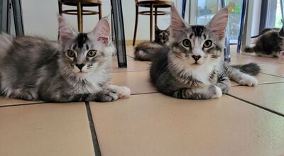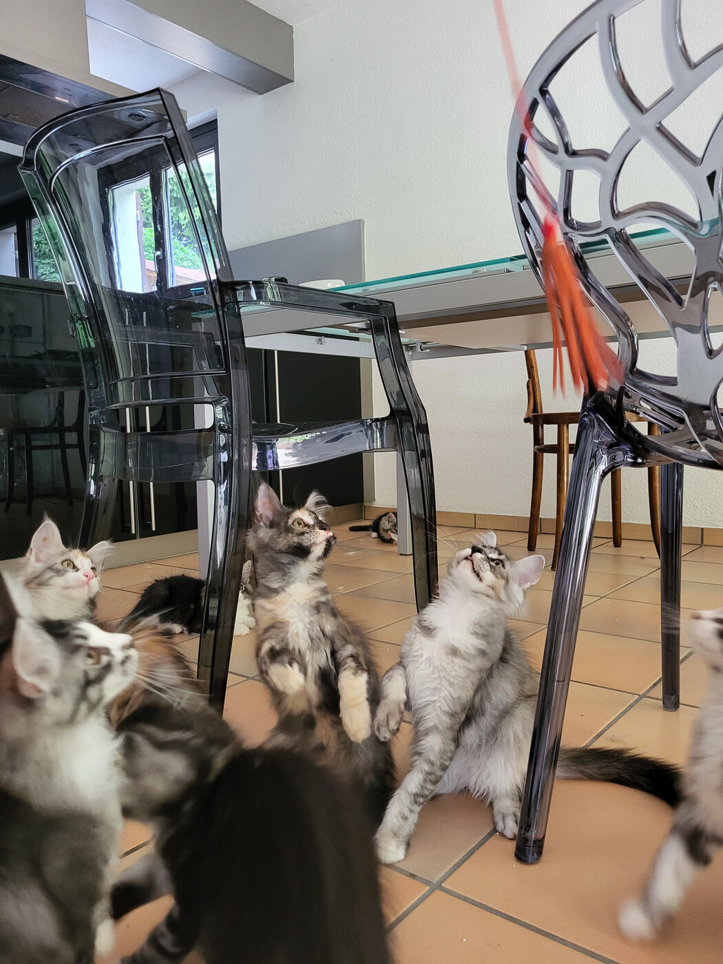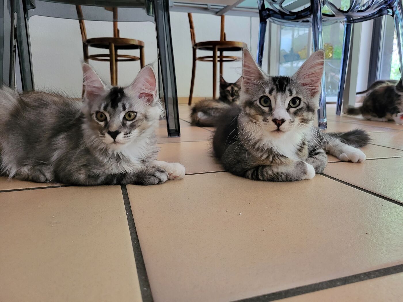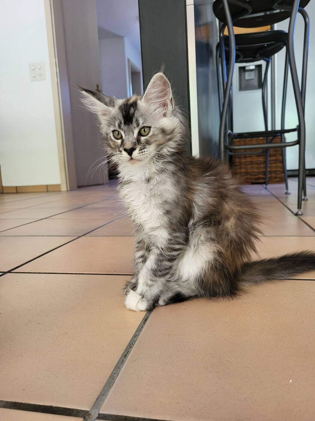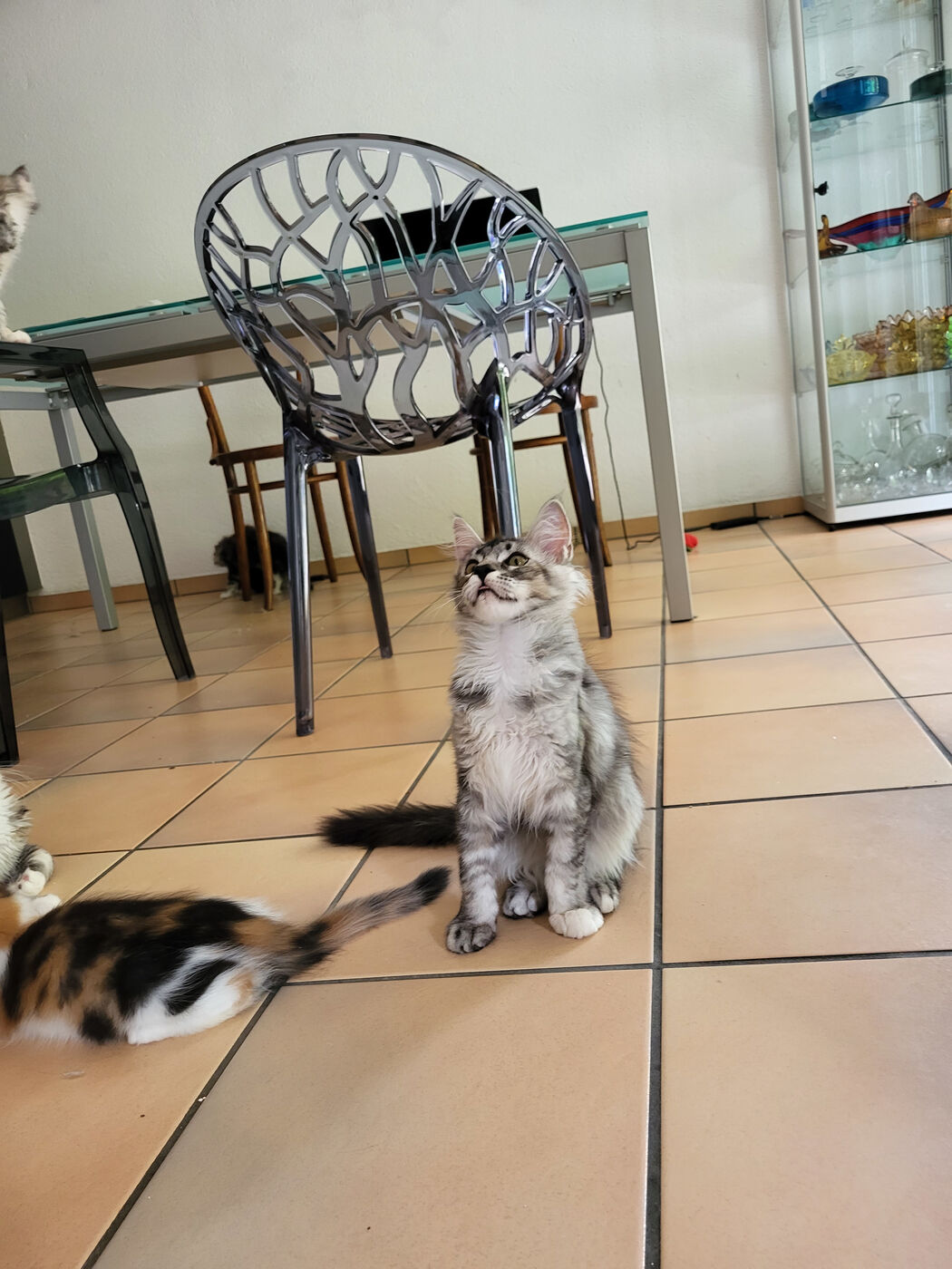Pebbles ist die Erstgeborene. Ihren Namen, er bedeutet Kieselsteinchen, hat sie bekommen, da sie die kleinste des Wurfes war. Nun ja, so kann man sich täuschen. Mittlerweile ist sie die Zweitgrößte, nach dem, wirklich sehr groß geratenen, Pontiac. Sie hat wirklich riesige Pfoten. Spricht alles dafür, das sie eine große, kräftige Kätzin wird.